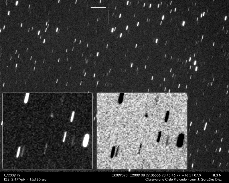Estas son las imágenes de dos cometas tomadas esta noche. El C/2009 P2 es un cometa realmente debil, que parece mostrar una incipiente cola, mientras el 217P es un cometa mucho más brillante, que tiene un aspecto impresionante. Estas imágenes están tomadas con el equipo del observatorio funcionando a pleno rendimiento.