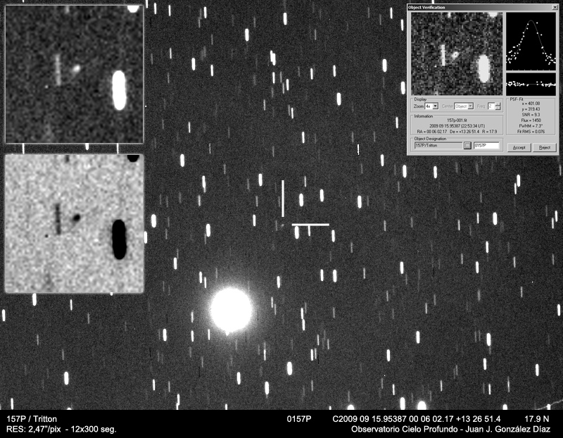 Con una mejor noche he conseguido en esta ocasión una imagen más detallada de este debil cometa, que ronda actualmente la magnitud 18. Se trata de 12 tomas de 300 segundos. En ese momento el cometa estaba a unos 170 millones de kilómetros de la tierra.