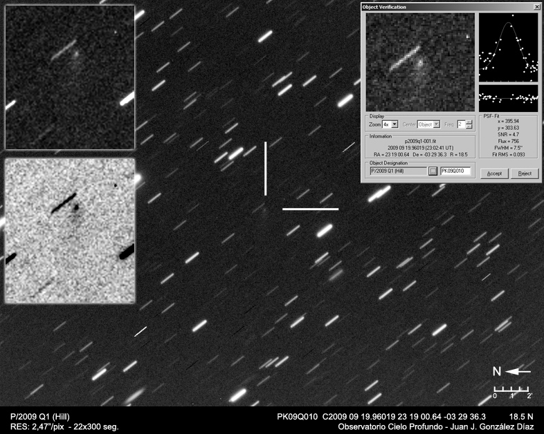 Dos nuevas capturas de este fin de semana … se trata de los cometas P/2009 Q1, relamente debil con una magnitud cercana a 19, y el 217P, mucho más brillante y con una estructura realmente interesante. En ambos casos se ha realizado en torno a dos horas de exposición total, en tomas de 300 y de 180 segundos.