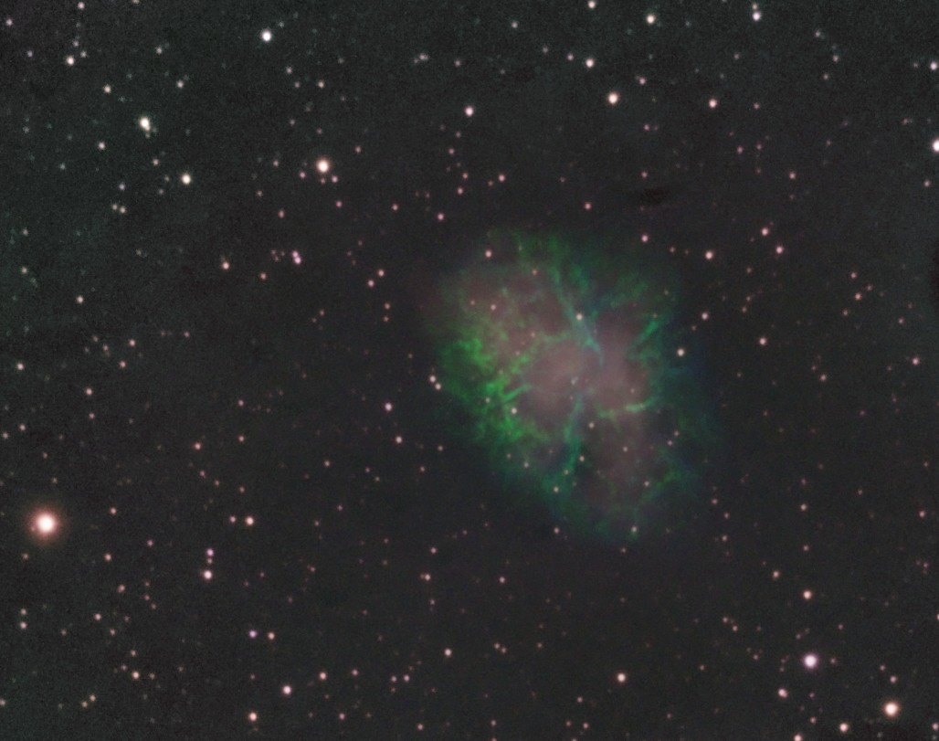 La pasada noche, en un medio claro entre las nubes, he realizado un puñado de tomas en tres bandas distintas, H.Alpha, OIII e Infrarrojo de M1, y me ha sorprendido mucho el aspecto de la nebulosa en IR. Esto no es más que un experimento, porque entre las nubes y la luna y que solo son tres o cuatro tomas de cada canal, la imagen no sirve de mucho, pero me ha permitido hacerme una idea de lo que se puede esperar de algo así, y en cuanto pueda voy ha hacer una serie completa de tomas con más calidad para ver hasta donde puedo llegar.