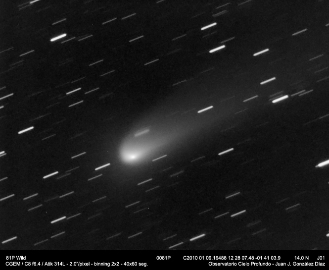 81P Wild 9 enero 2010 • Juanjo Gonzalez Una fotografía que acumula 40 mintos de exposición de éste impresionante cometa, el 81P Wild. En este momento se encuentra a unos 170 millones de km. de nosotros. Comparte esto: Haz clic para compartir en Facebook (Se abre en una ventana nueva) Facebook Haz clic para compartir en X (Se abre en una ventana nueva) X Me gusta Cargando... Relacionado