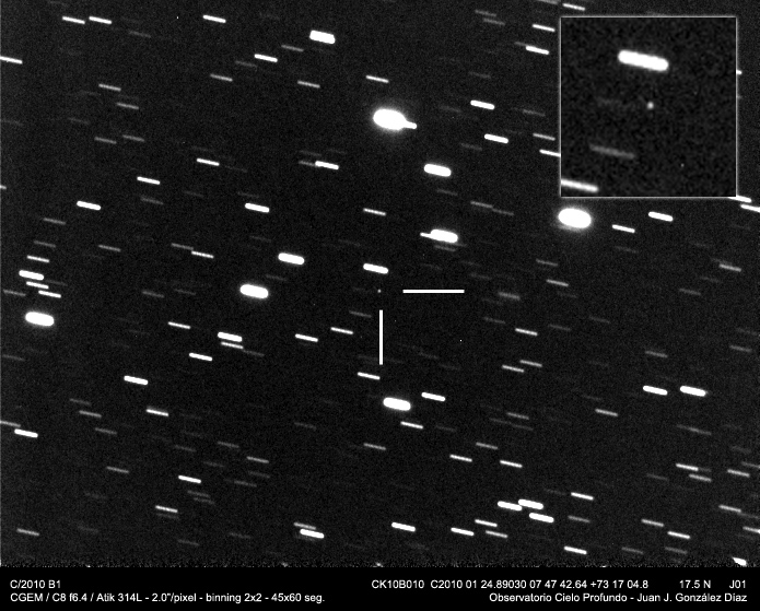 La pasada noche he podido fotografiar este interesante cometa recien descubierto. A pesar de que en un principio su apariencia era de asteroide, los cálculos preliminares de su orbita hicieron sospechar a muchos que se podría tratar de un cometa, y finalmente un grupo de astrónomos aficionados desde España han conseguido medir una tenue coma alrededor del objeto, confirmando así su origen cometario.