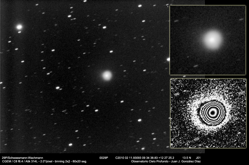 Una nueva imagen del cometa 29P en pleno proceso de expansión ocasionado por su último estallido de actividad. Vemos sun gran aumento tanto de tamaño como de brillo. El cometa se encuentra realmente lejos de nosotros (unos 800 millones de km.), ya que su órbita siempre permanece más alla de la del planeta Júpiter.