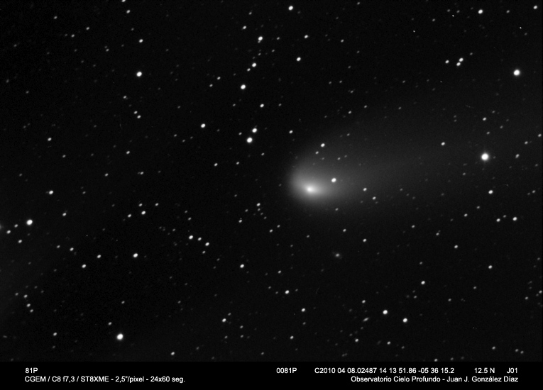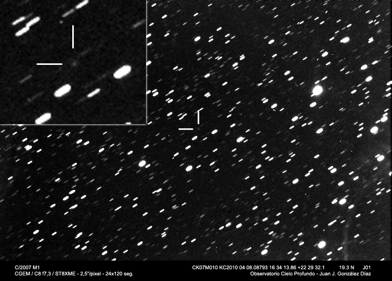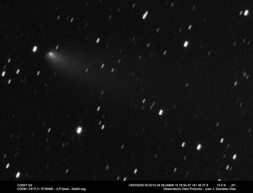 Nuevas fotografías de algunos cometas interesantes, ahora que por fin tenemos una racha de buen tiempo. En éste caso se trata del un cometa realmente debil y difícil de fotografiar, como es el C/2007 M1 y dos espectaculares cometas que están ahora mismo mostrando su mejor imagen. Por un lado el 81P, con unas formas realmente interesantes en su coma y su cola, y el C/2007 Q3, que se sabe tiene su núcleo fragmentado, pero que es realmente difícil de resolver en sus dos partes.