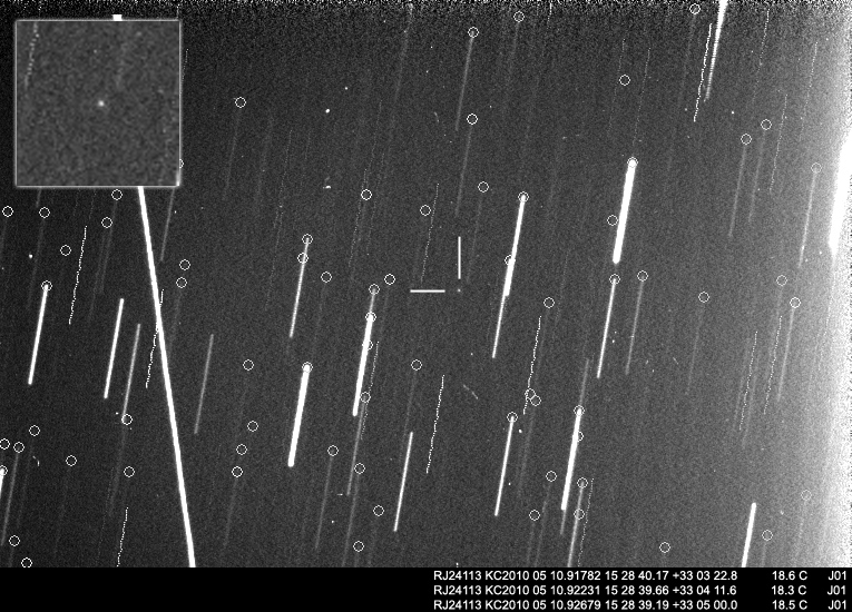 Un nuevo neo capturado la pasada noche desde el observatorio operado de forma remota. Designado inicialmente como RJ24113, presentaba un movimiento bastante rápido de 7,5″/min. y un brillo de tan sólo 18.5 … aún así no ha sido muy dificil fotografiarlo y medirlo. La imagen superior está creada a partir de 48 tomas de 20″. No se pueden hacer exposiciones más largas porque su movimiento tán rápido haría que apareciera deformado, y su medición no sería correcta.