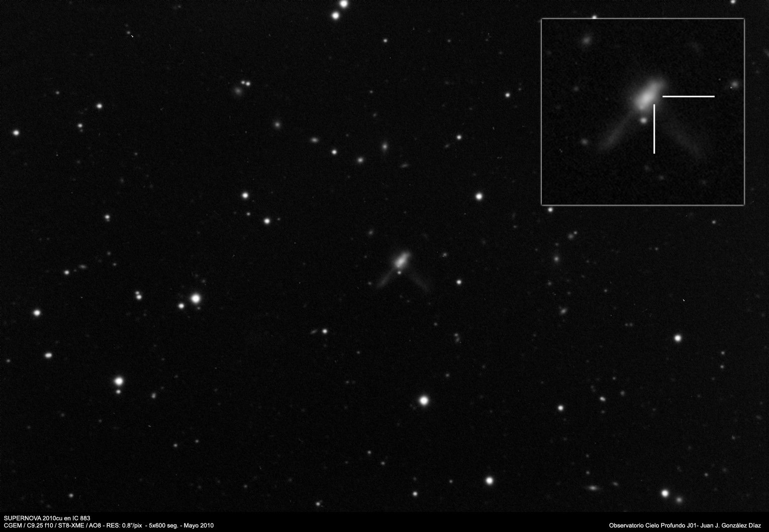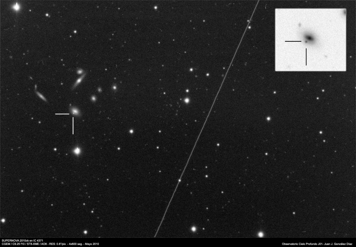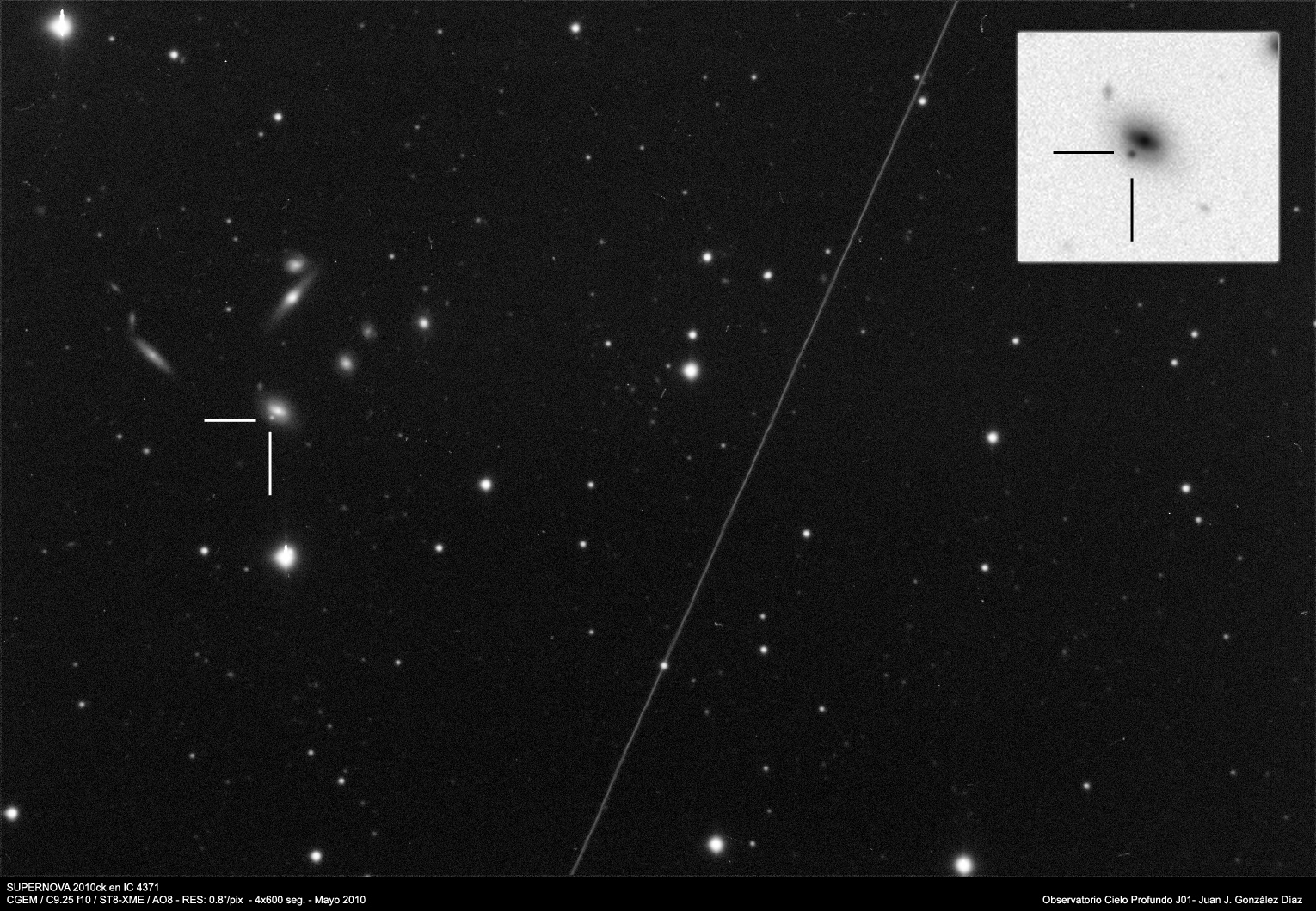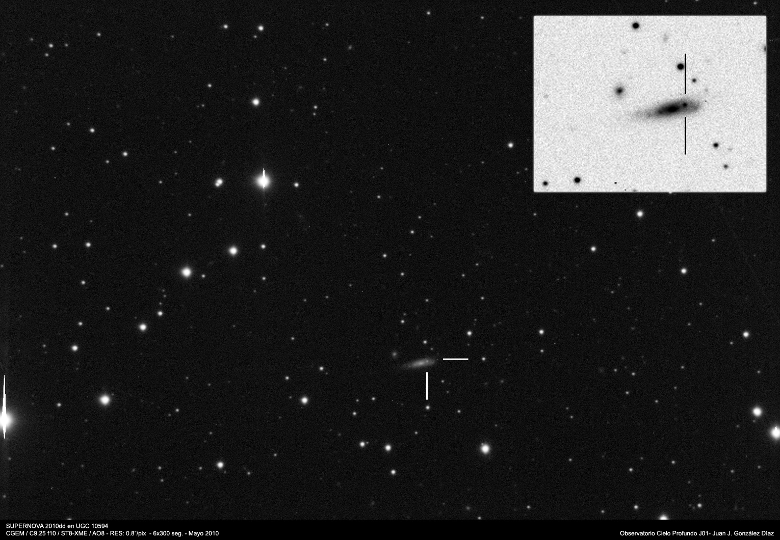 Colección de supernovas 1 junio 2010 • Juanjo Gonzalez Imágenes de algunas de las últimas supernovas descubiertas en el último mes, fotografiadas en la parte final del mes de mayo. Se trata de las supernovas sn2010cu, sn2010ck, sn2010db y sn2010dd. Comparte esto: Haz clic para compartir en Facebook (Se abre en una ventana nueva) Facebook Haz clic para compartir en X (Se abre en una ventana nueva) X Me gusta Cargando... Relacionado