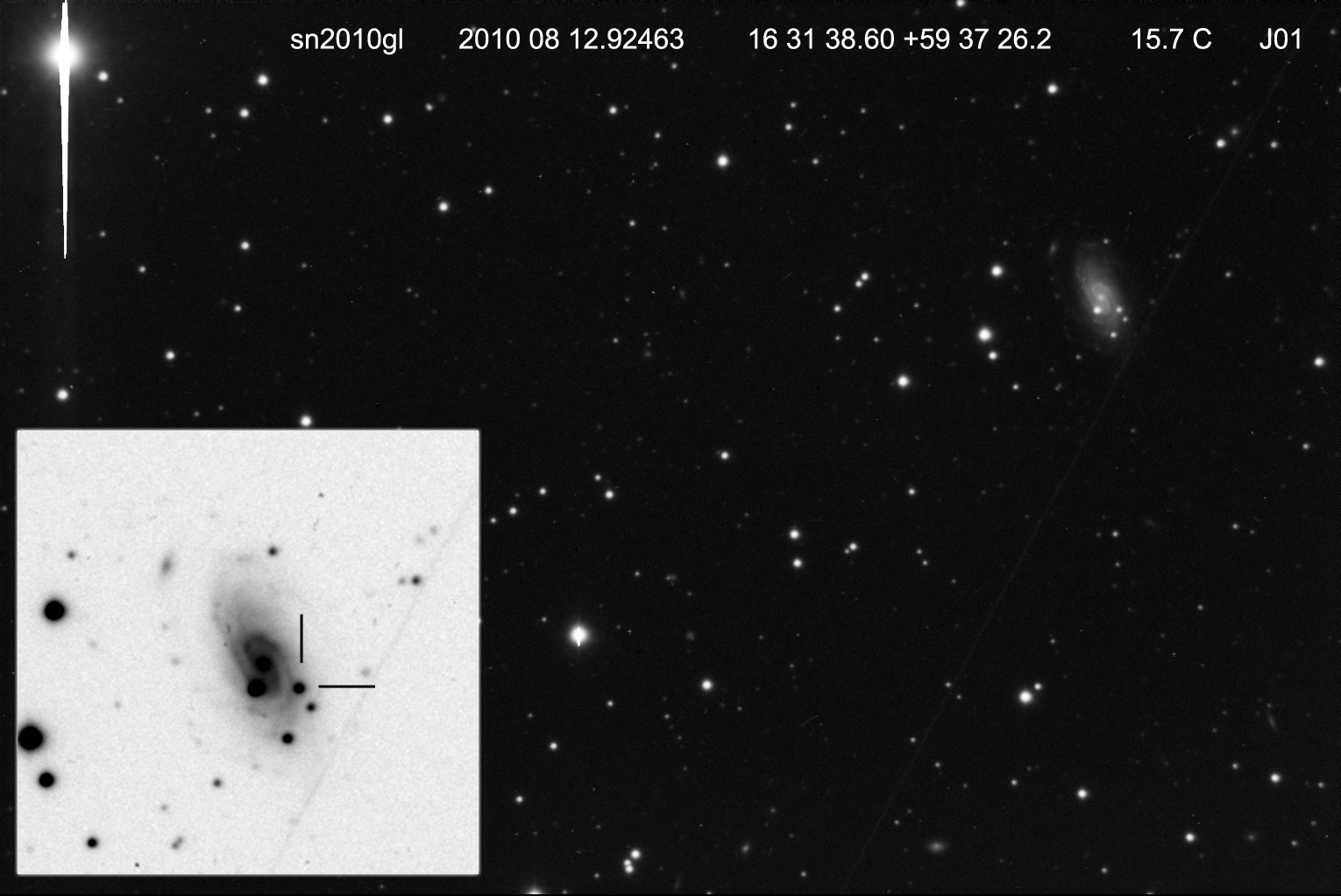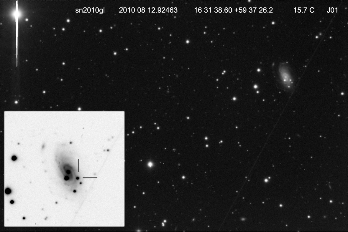 Supernova SN2010gl 13 agosto 2010 • Juanjo Gonzalez Imágen de esta interesante supernova de brillo moderado aparecida en la galaxia NGC 6189. Una nueva oportunidad para contemplar una bonita galaxia y uno de los fenómenos más violentos de la naturaleza. Comparte esto: Haz clic para compartir en Facebook (Se abre en una ventana nueva) Facebook Haz clic para compartir en X (Se abre en una ventana nueva) X Me gusta Cargando... Relacionado