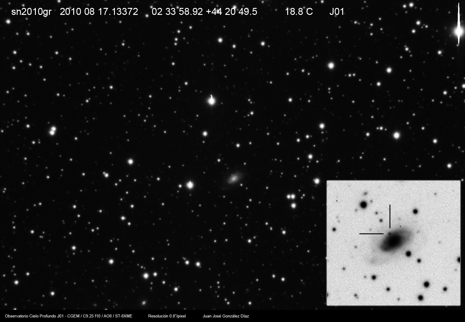 Supernovas SN2010ga y SN2010gr 19 agosto 2010 • Juanjo Gonzalez Imagenes obtenidas hace algunas noches de estas dos interesantes supernovas. Como siempre son una buena oportunidad para observar algunas galaxias lejanas, pero siempre interesantes. Comparte esto: Haz clic para compartir en Facebook (Se abre en una ventana nueva) Facebook Haz clic para compartir en X (Se abre en una ventana nueva) X Me gusta Cargando... Relacionado
