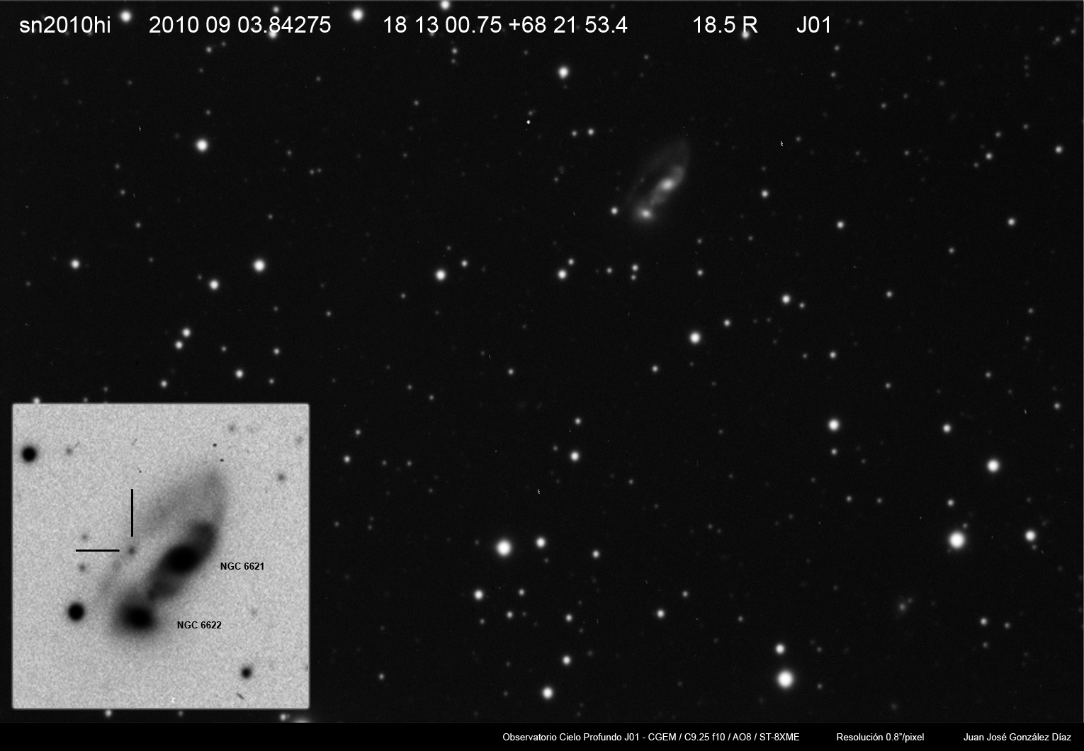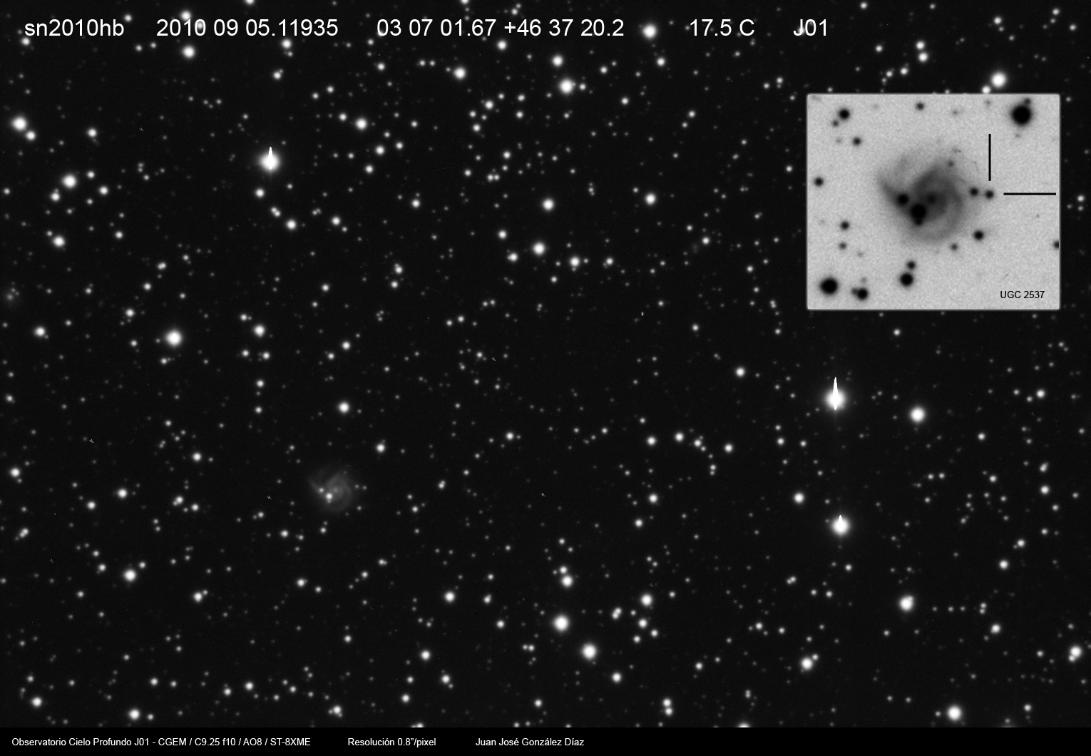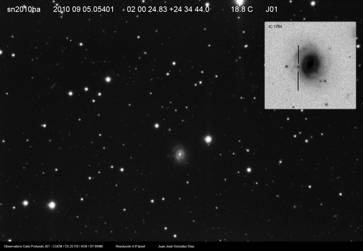 Imágenes de tres de las últimas supernovas descubiertas, todas ellas situadas en galaxias especialmente interesantes. Como es normal en los últimos meses por culpa del calor extremo que hace por las noches, la turbulencia atmosférica (seeing) es horrible, y ocasiona imágenes bastante faltas de definición.