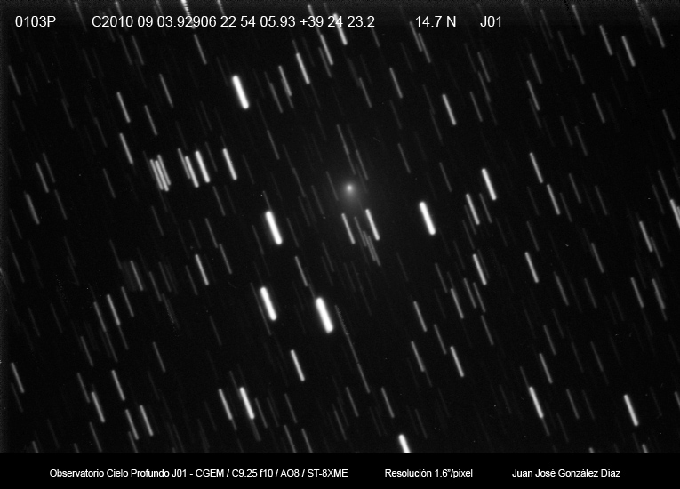 Cometa 103p 6 septiembre 2010 • Juanjo Gonzalez Un captura de éste interesante cometa, tomada hace unas noches. Es de los pocos que actualmente presentan una actividad interesante, en una año que está resultando flojo en cuanto a cometas se refiere. Comparte esto: Haz clic para compartir en Facebook (Se abre en una ventana nueva) Facebook Haz clic para compartir en X (Se abre en una ventana nueva) X Me gusta Cargando... Relacionado