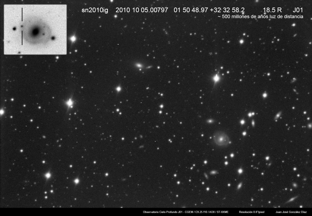 Esta supernova se ha producido en una galaxia situada a la nada despreciable distancia de 500 millones de años luz, momento en el que los fotones producidos por el destello de la explosión comenzaron su viaje hasta nosotros, hasta quedar atrapados en el sensor de mi cámara CCD.