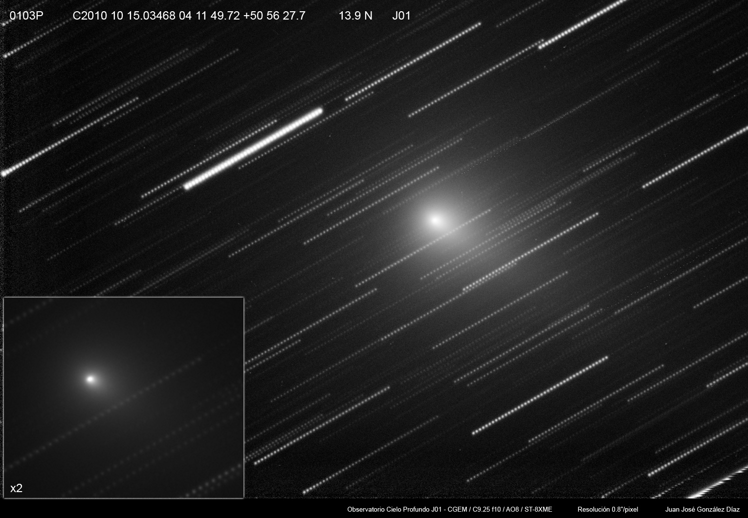 El cometa 103P en alta resolución 17 octubre 2010 • Juanjo Gonzalez Una imagen del cometa 103P tomada en alta resolción, a 0.8″ de arco por pixel. Podemos ver también en ella un detalle del núcleo ampliado dos veces. Comparte esto: Haz clic para compartir en Facebook (Se abre en una ventana nueva) Facebook Haz clic para compartir en X (Se abre en una ventana nueva) X Me gusta Cargando... Relacionado