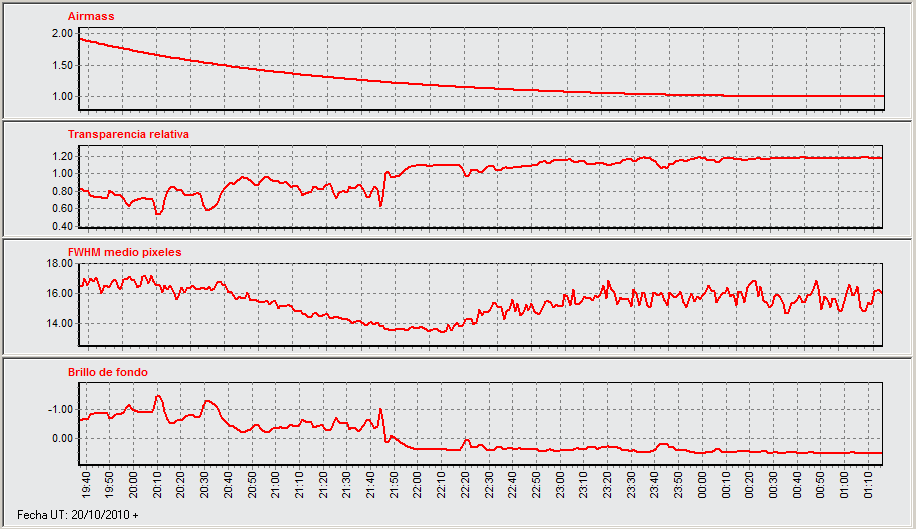 El resultado no ha sido bueno, ya que una seria de nubes altas arruinaron las primeras horas de observación. La fotometría diferencial es una técnica muy sensible a cualquier cambio de luminosidad en la imagen, especialmente los gradientes que generan las nubes. Aún así, el tránsito se aprecia perfectamente, y en su tramo final la calidad es más que aceptable.