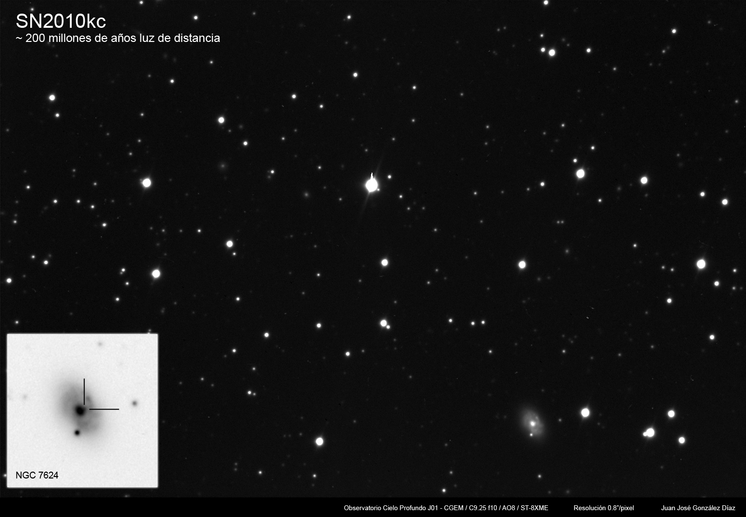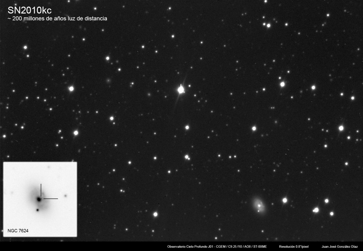 Una nueva supernova, que apenas se distingue del núcleo de la galaxia NGC 7624. El seeing no daba para mas esa noche, y la SN aparece como un grumo que resulta imposible de medir. El conjunto SN y galaxia se encuentra a unos 200 millones de años luz de distancia.