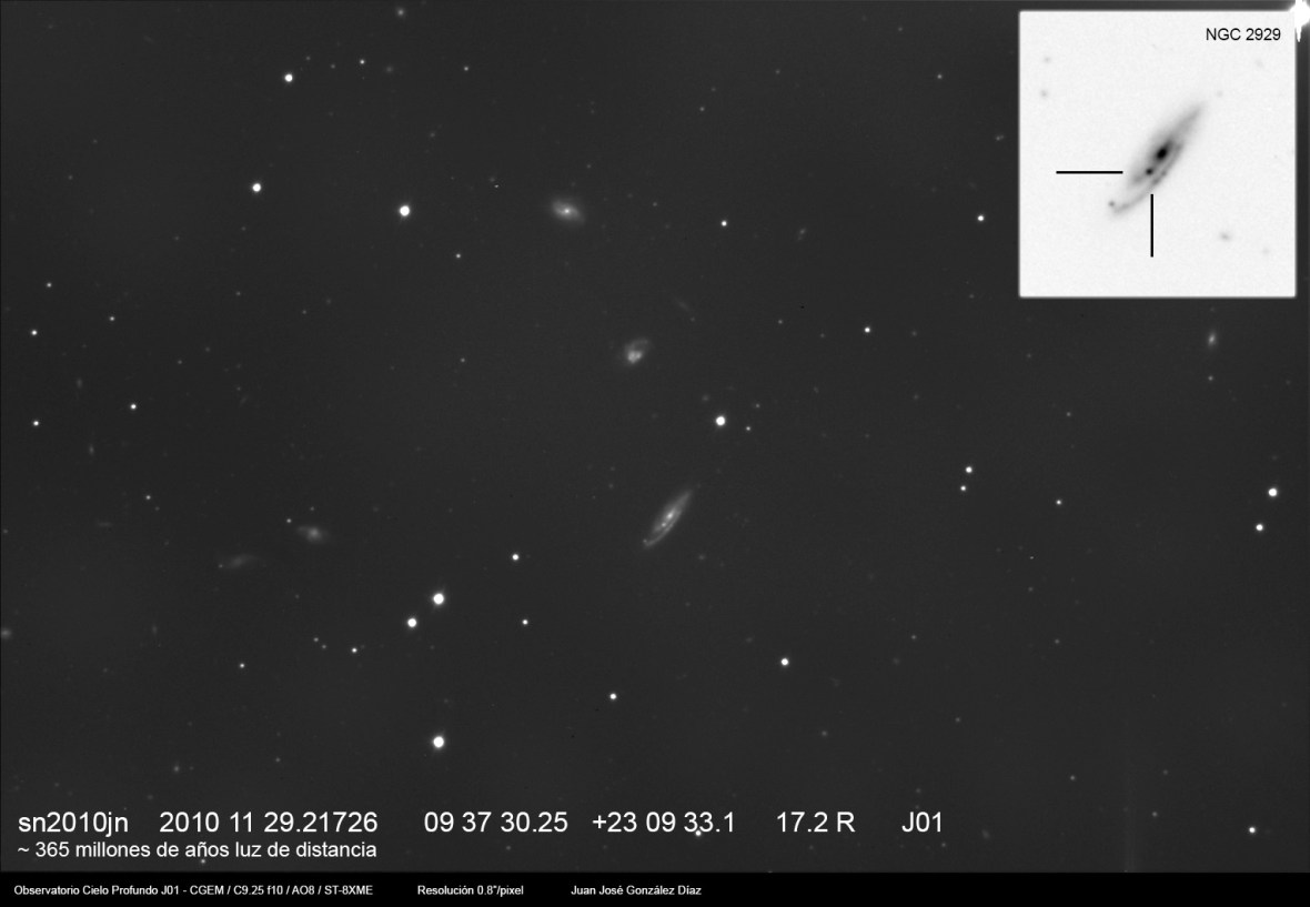 Otra supernova, esta vez un poco más lejana, aparentemente más alla de los 350 millones de años luz. Es un campo de galaxias increible, pero es una pena que la cercana luna arruinase casi por completo la imagen. La galaxia anfitriona del estallido estelar es NGC 2929, realmente interesante, como lo son muchas de sus compañeras en la zona