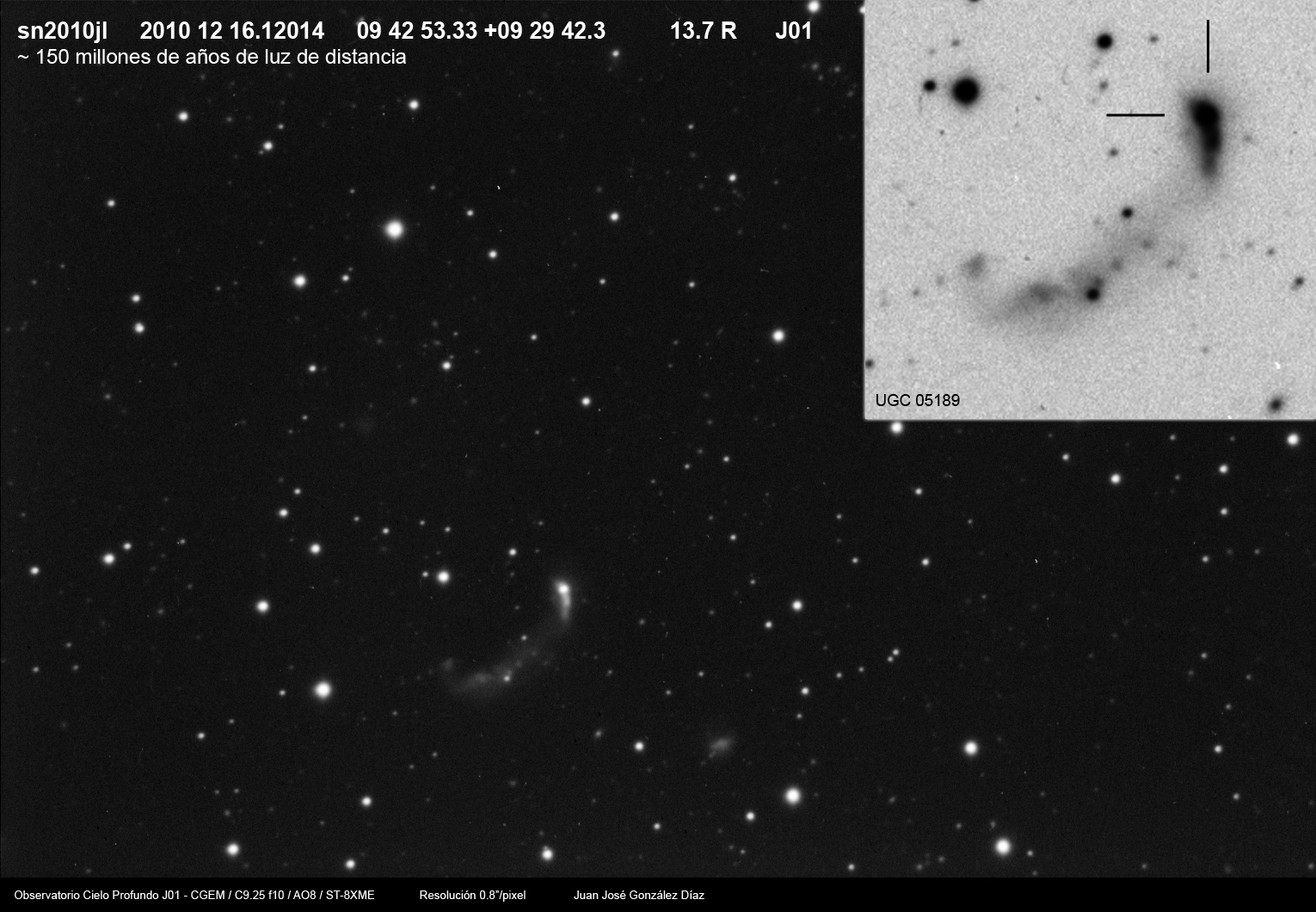 Se encuentra en la galaxia UGC 05189, que presenta una forma realmente curiosa, más parecida a una nebulosa que otra cosa. Pensando en la distancia que nos separa, unos 150 millones de años luz, y el brillo que ha alcanzado la SN, podemos imaginar lo colosal que ha tenido que ser la explosión.