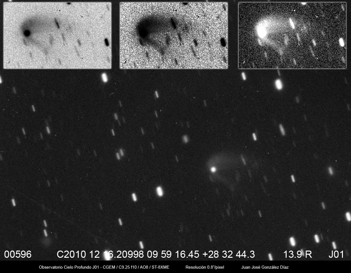 La pasad noche he vuelto a fotografiar el interesante fenómeno que sucede en el asteoride (596) Scheila. Se aprecia perfectamente la cola de polvo, como decimos fruto apartente de una colisión con otro asteroide mucho más pequeño. Esta fotografía suma una hora de exposición, con un fondo de cielo de 19.5 y un FWHM de 2.9″