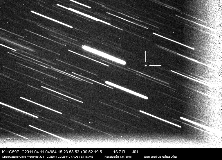 La pasada noche he podido capturar con tomas de 45″ este interesante NEO descubierto hace unos días desde el observatorio de La Sagra. El día 15 pasará a unos 400.000 km. de la Tierra (poco más de la distancia hasta la Luna) moviendose por el cielo con una mag. 14 a unos 180″/minuto. Su velocidad real es casi 100.000 km. por hora