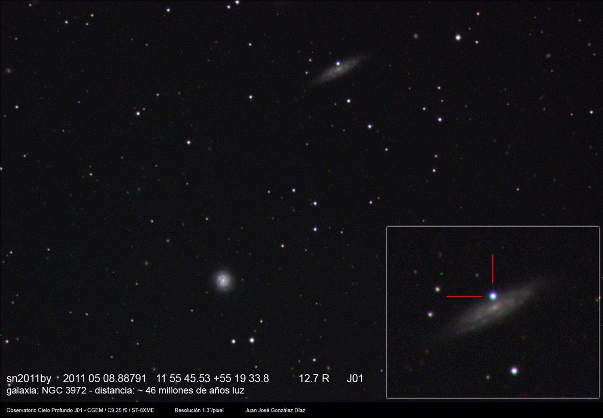 Brillante supernova descubierta en la Galaxia NGC3972, que con una magnitud entorno a 12.5 es visible incluso visualmente a través de un telescopio de tipo medio desde cielos oscuros. La galaxia se encuentra a unos 46 millones de años luz de nosotros, y viendo la imagen nos podemos dar cuenta de la potencia de la explosión estelar.