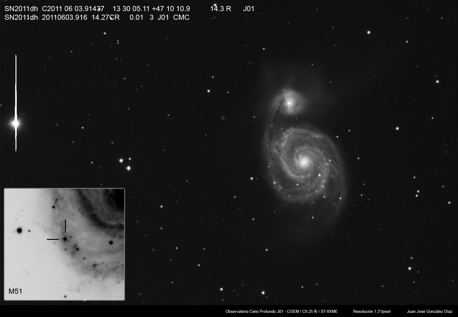 Impresionante supernova que acaba de ser descubierta en la Galaxia M51. Estas imágenes corresponden a una captura de esta misma noche, presentando la SN una magnitud de 14.3. La imagen la componen 8 tomas de 450″ cada una.