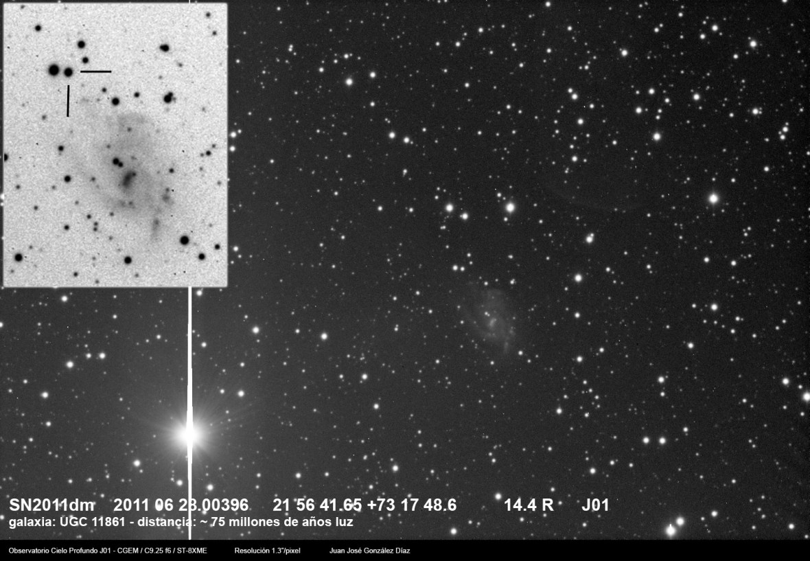 Otra interesante y relativamente brillante supernova capturada la pasada noche. Como siempre la visión de estas descomunales explosiones estelares es siempre fascinante, y más si se encuentran en una galaxia tan peculir. Su distancia aprox. es de 75 millones de años luz.