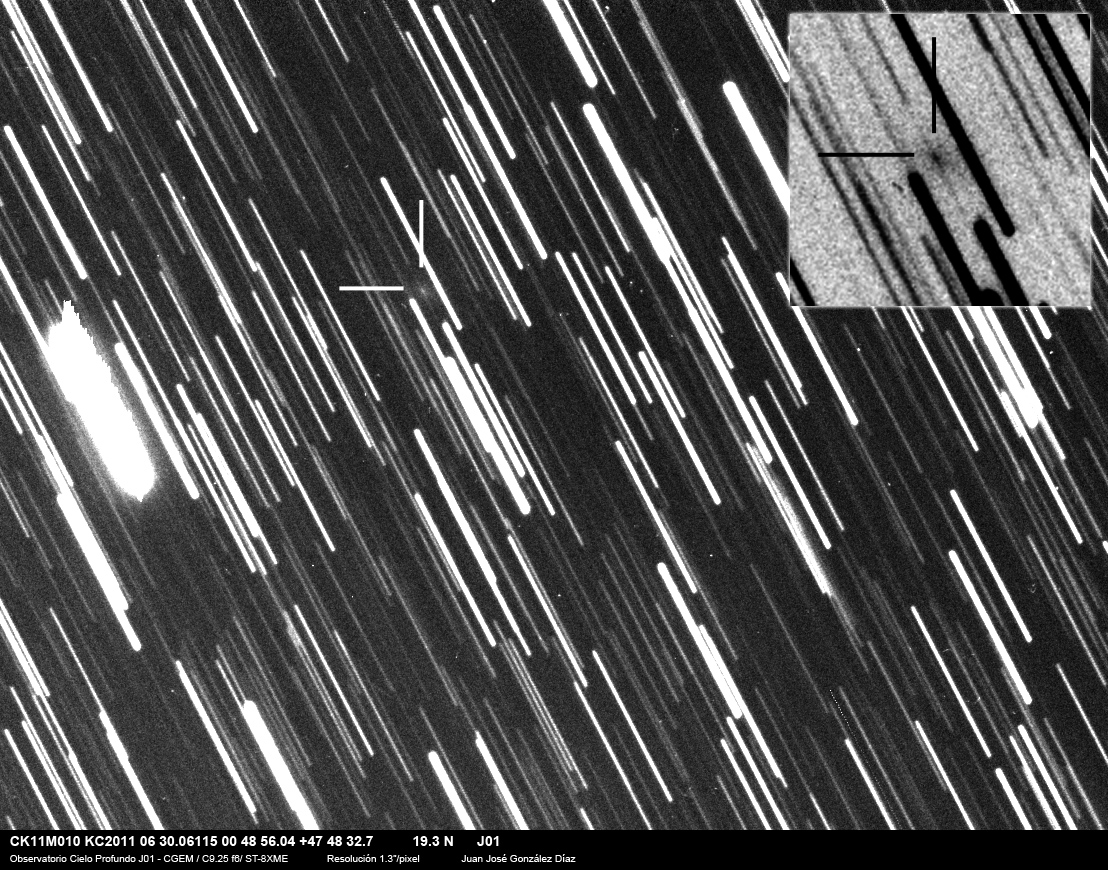 Captura de la pasad noche del último cometa descubierto hasta el momento. Es un objeto muy complejo de capturar y de medir, ya que es a la vez muy difuso, débil, se mueve muy rápido y el campo estelar es muy rico, así que he necesitado realizar más de 140 tomas para poder cazarlo con claridad.