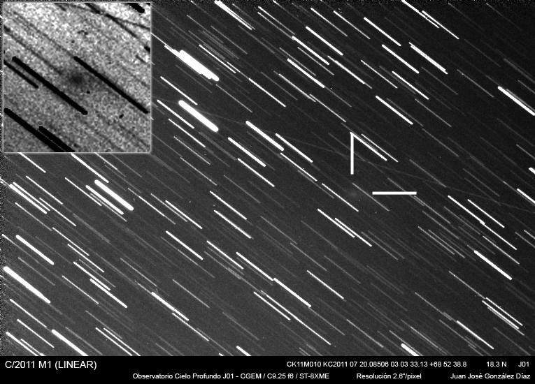 Resulta realmente complicado capturar una imágen y realizar unas medidas astrométricas de este cometa. He tenido que seguirlo durante dos noches para poder obetener una imagen del mismo. Su debilidad, lo rápido que se mueve, lo difuso que es y el campo de estrellas por el que se desplaza, forman una combinación realmente fatal para estudiarlo.