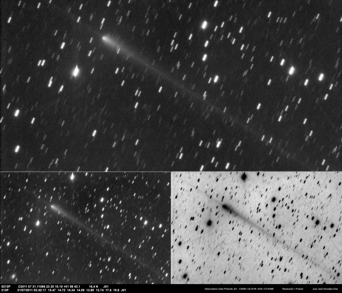 Impresionante cometa que tenemos ahora mismo en nuestros cielos, y al que no había prestado mucha atención. Es impresionante la cola que presenta, aunque es bastante débil, y he necesitado unas dos horas de integración para conseguir esta imagen. El cometa se encuentra a unos 200 millones de km. de nosotros, y esperamos su mayor brillo para finales de Agosto, rondando entonces la mag. 14