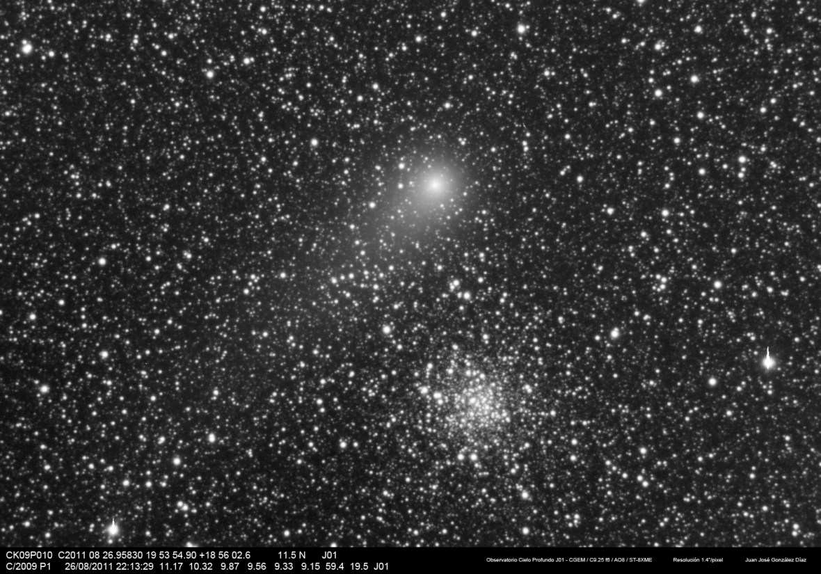 De vez en cuando el universo nos regala imágenes que sólo podemos ver una vez en la vida. Este es el caso del cercano encuentro de la pasada noche entre el bonito cometa C/2009 P1 y el cúmulo globular M71, que ya no se va a volver a repetir, al menos a corto plazo.