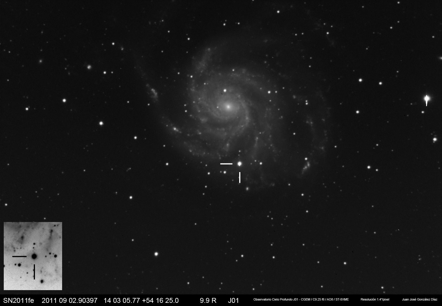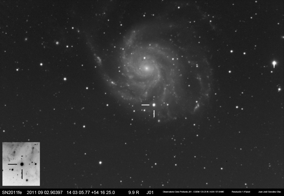 Nueva obervación de esta noche de la supernova SN2011fe en M101. Se ha superado la mag. 10, concretamente mag. 9,9 ahora mismo. Esto hace que la SN sea visible en visual con instrumentos bastante modestos o cielos no demasiado oscuros.