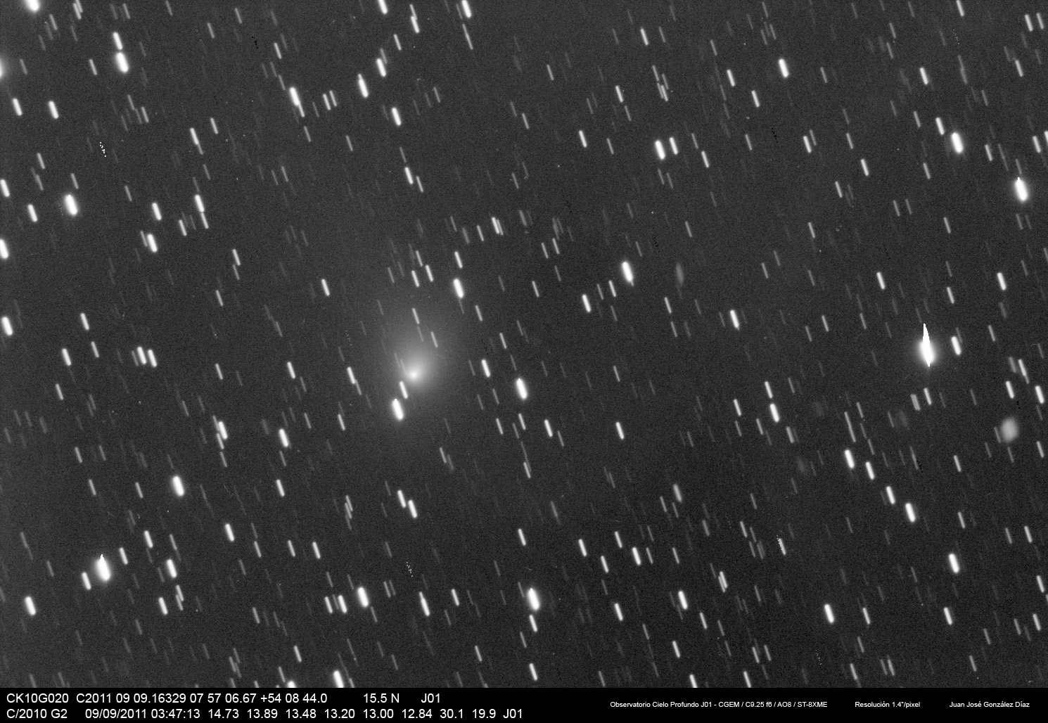 Nueva captura del Cometa C/2010 G2 (Hill) 13 septiembre 2011 • Juanjo Gonzalez Una nueva observación de este interesante cometa tras su paso por el perihelio. En la actualidad se encuentra a unos 325 millones de km. de nosotros y se podrá observar en buenas condiciones hasta bien entrado el año 2012. Comparte esto: Haz clic para compartir en Facebook (Se abre en una ventana nueva) Facebook Haz clic para compartir en X (Se abre en una ventana nueva) X Me gusta Cargando... Relacionado
