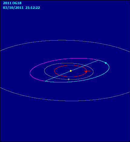 Epoch 2011 Aug. 7.0 TT = JDT 2455780.5 MPC M 260.95006 (2000.0) P Q n 0.25339671 Peri. 113.72720 +0.40309213 -0.91217989 T = 2456171.38881 JDT a 2.4732541 Node 312.28955 +0.79912929 +0.39013249 q = 2.2659728 e 0.0838091 Incl. 5.72454 +0.44599228 +0.12539732 P 3.89 H 17.2 G 0.15 From 26 observations 2011 July 25-Sept. 26.![]()