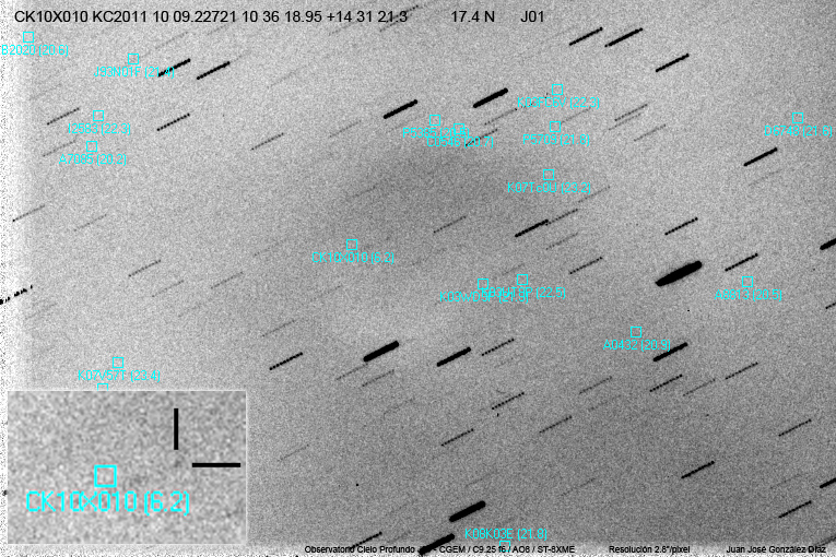 Esta mañana he intentado fotografiar la zona del C/2010 X1, ya al amanecer y en bastantes malas condiciones. He visto un objecto en movimiento en la zona con unas caráctirístcias que podrían ser las del cometa, mag. 17,4, aunque lo digo con todas las reservas, porque el objecto es débil y no tengo muy claro que no sea otra cosa. También parece apreciarse una zona de condensación más cerca de la zona teórica donde se debería de encontrar el cometa, pero eso ya no lo he podido medir.