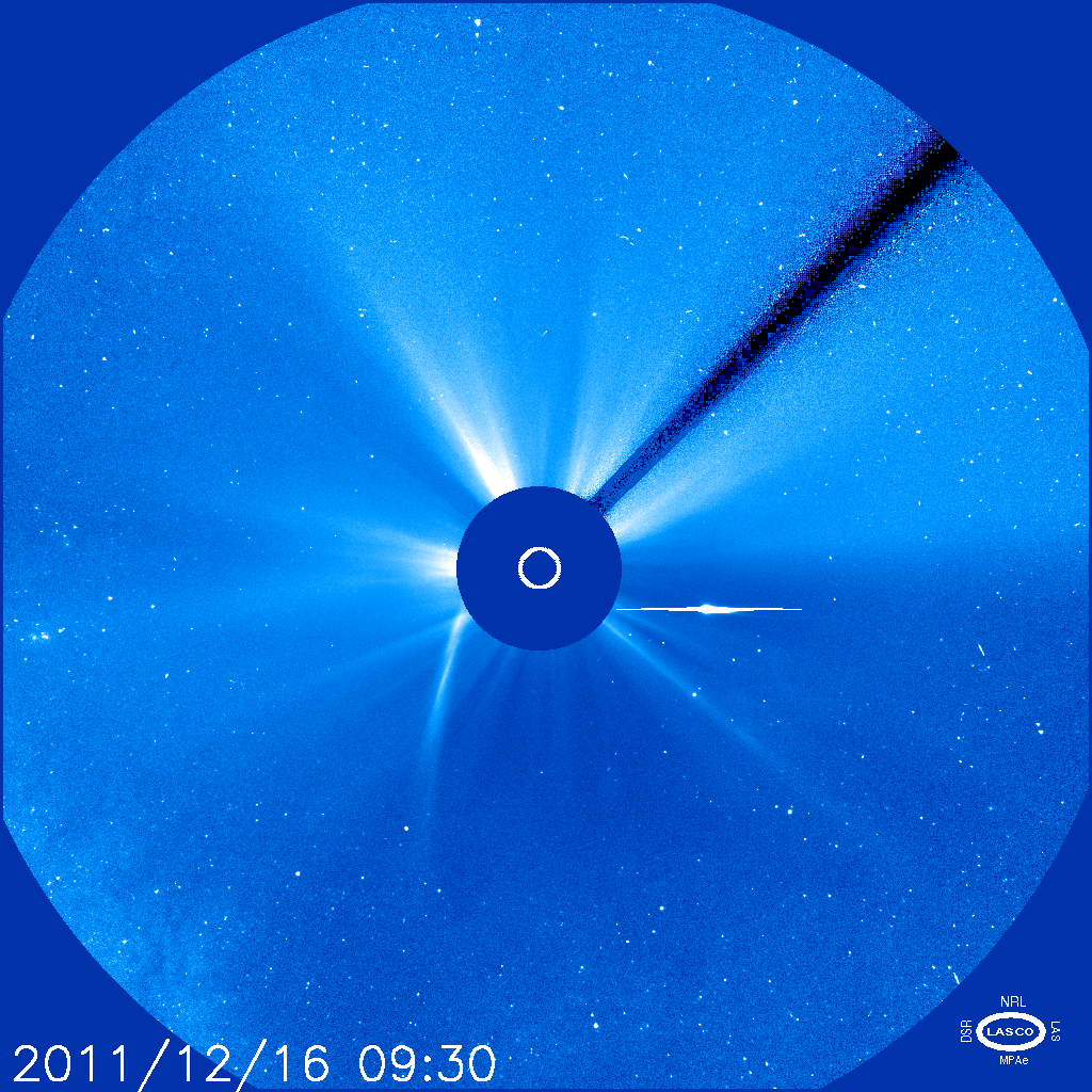 He conseguido las dos últimas imágenes LASCO y parece que efectivamente el objeto puntual brillante se mueve en la dirección prevista del cometa, osea que parece confirmarse que su núcleo ha sobrevivido al paso por las cercanías del Sol, y además de forma increible se ha desconectado de su cola. Fascinante.