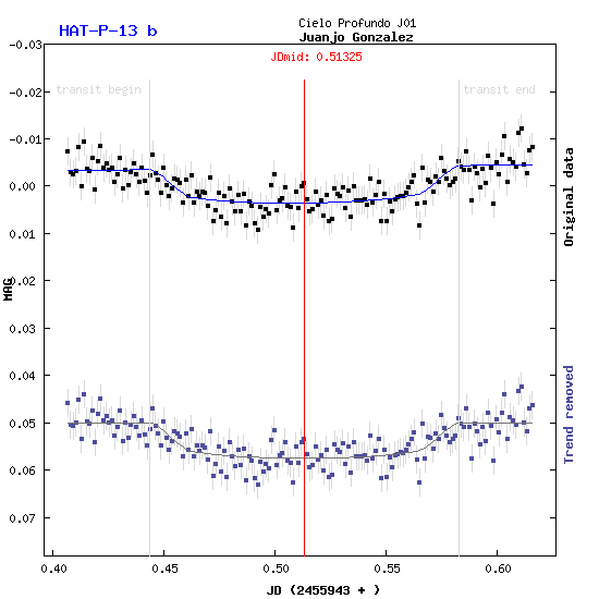 La pasada noche he podido observar el tránsito del exoplaneta HAT-P-13 b. De los datos obtenidos podemos calcular que se trata de un planeta con un tamaño 1.26 veces mayor que Júpiter, y que gira en torno a su estrella con un periodo de sólo 2.9 días.