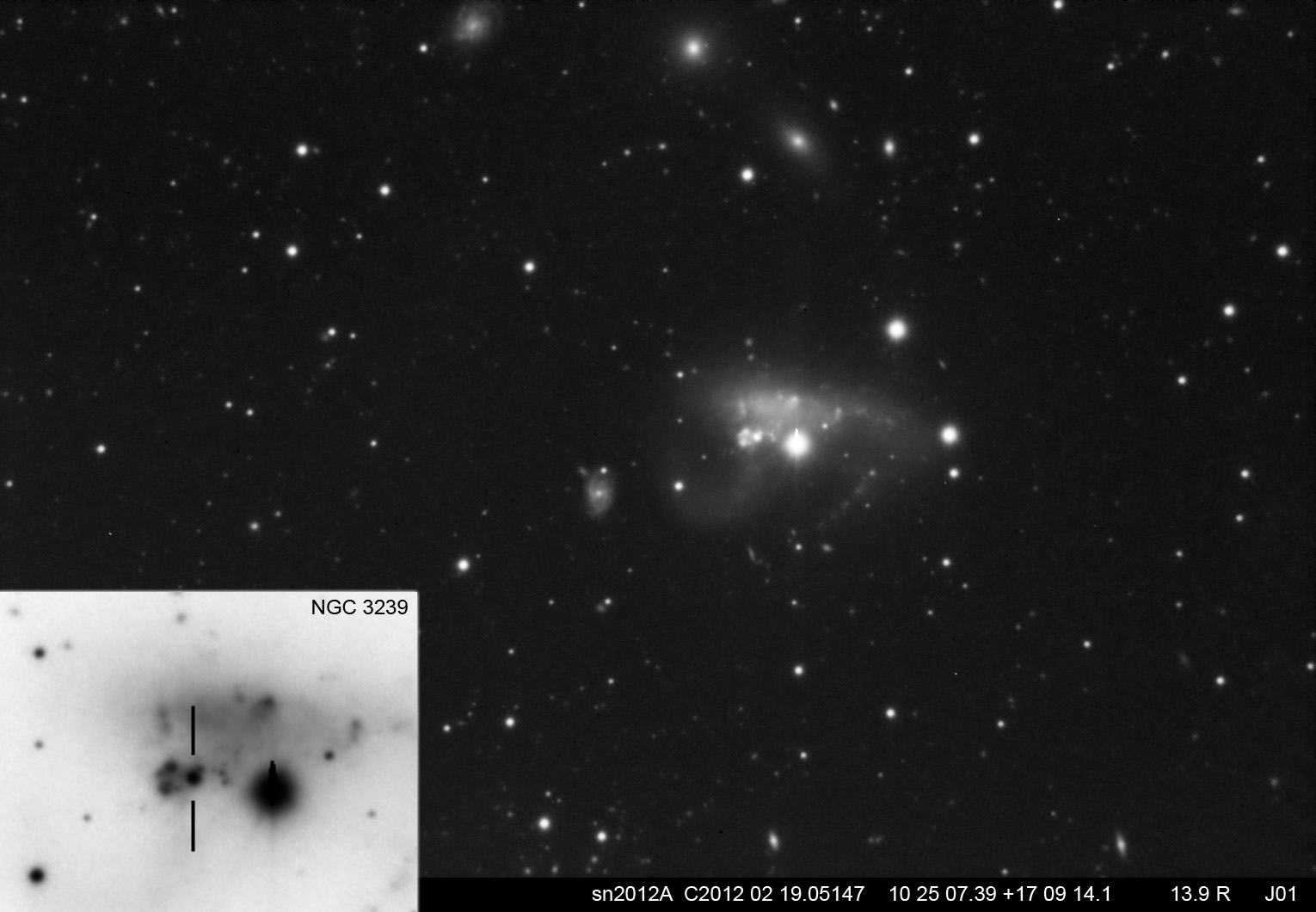 Supernova sn2012A 19 febrero 201219 febrero 2012 • Juanjo Gonzalez Una nueva imagen de esta inetersante supernova, la primera descubierta este año. La SN presenta un mag. 13.9 y la imagen es el resultado de acumular 2 horas de exposición en tomas de 300″. La resolución de la fotografía es de 0.8″ / pixel. Comparte esto: Haz clic para compartir en Facebook (Se abre en una ventana nueva) Facebook Haz clic para compartir en X (Se abre en una ventana nueva) X Me gusta Cargando... Relacionado