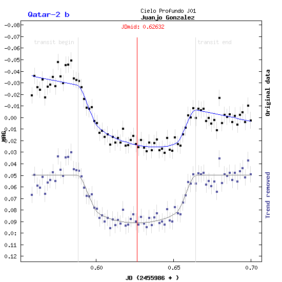 Un nuevo exoplaneta cuyo tránsito he tenido la suerte de observar la pasada noche. Se trata del Qatar-2 b, un planeta de tipo Júpiter caliente que completa una órbita a su estrella (0.75 veces el tamaño de nuestro Sol) en 1.33 días terrestres. Este planeta tiene un tamaño un poco mayor que Júpiter, pero 2.5 veces su masa.