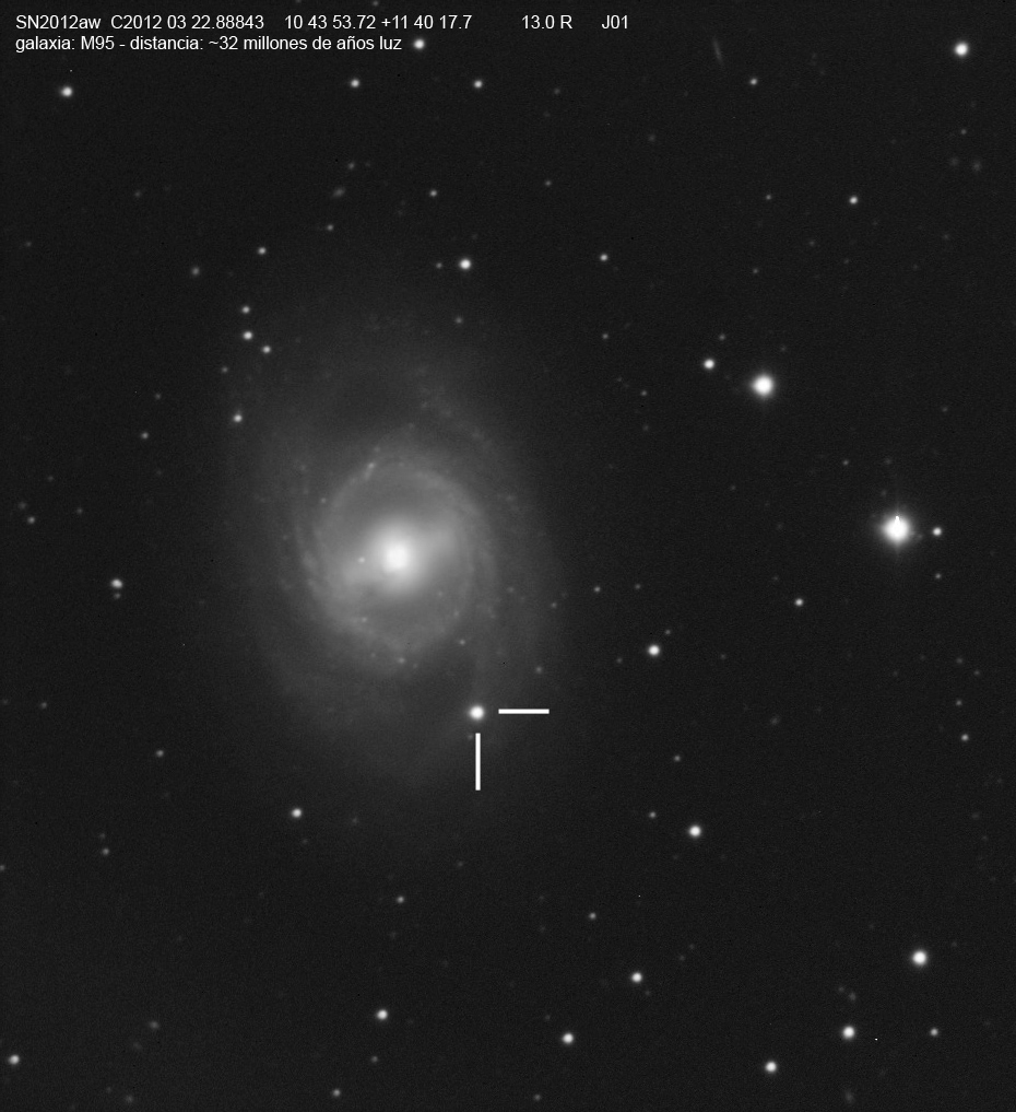 Primera observación de esta interesante supernova descubierta hace unos días en la Galaxia M95. Actualmente tiene una mag. 13 y merece la pena seguir su evolución para conocer hasta que brillo puede llegar. La colosal explosión ha sucedido hace unos 32 millones de años, pero la maravillosa máquina del tiempo que es nuestro telescopio nos permite observarla ahora.