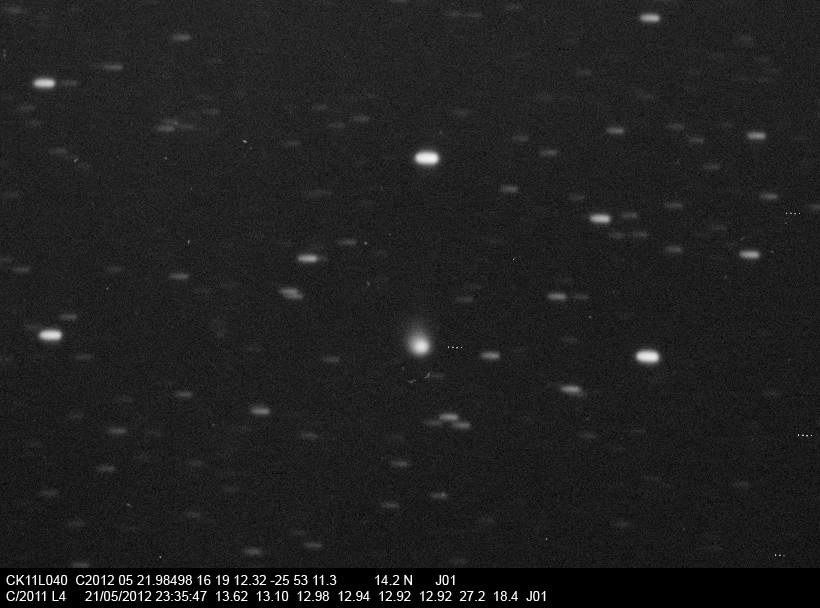 El otro cometa es el C/2011 L4 (PANSTARRS). Situado en estos momentos a 530 millones de km. de nosotros, podría dar un buen espectáculo durante el mes de Abril del año que viene, alcanzado una mag. teórica de 0.5 o mejor (aunque mal posicionado en esos momentos para nosotros). Aún así podría ser visible a simple vista, a ver como evoluciona.