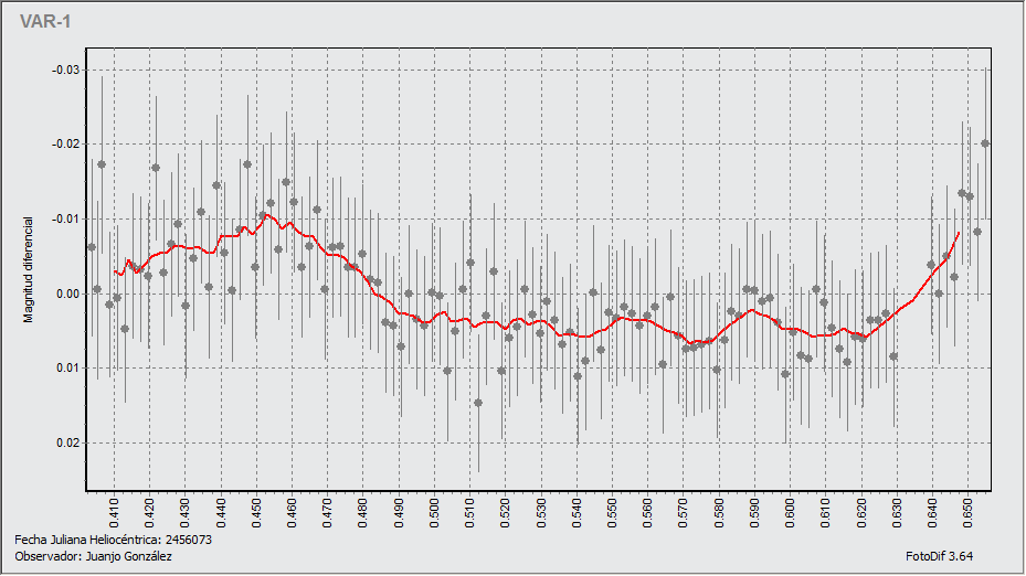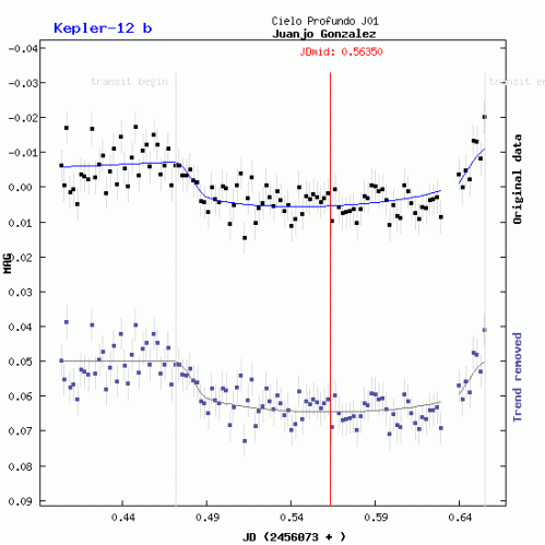 Este es el informe de la observación realizada del tránsito del exoplaneta Kepler-12b. Se trata de un planeta de tipo Júpiter caliente, que tiene un diámetro 1.7 veces mayor que el gigante de nuestro sistema solar, pero sólo 0.4 veces su masa. Está situado a casi 2.000 años luz de distancia, y completa una órbita alrededor de su estrella cada 4.43 días.