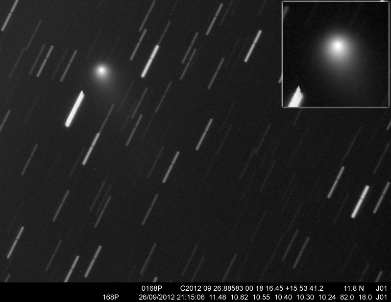 El cometa 168P ha sufrido hace un par de días un episodio de outburst (aumento importante de actividad) que ha elevado su magnitud visual en al menos dos unidades, alcanzado ahora mismo una mag. entorno a 10, visible por tanto con telescopios normales de aficionado desde un cielo oscuro. Este aumento de actividad se nota sobre todo en la aparición de un núclo con un alto grado de condensación, que es posible que se expanda con el paso de los días en forma de una bonita coma.