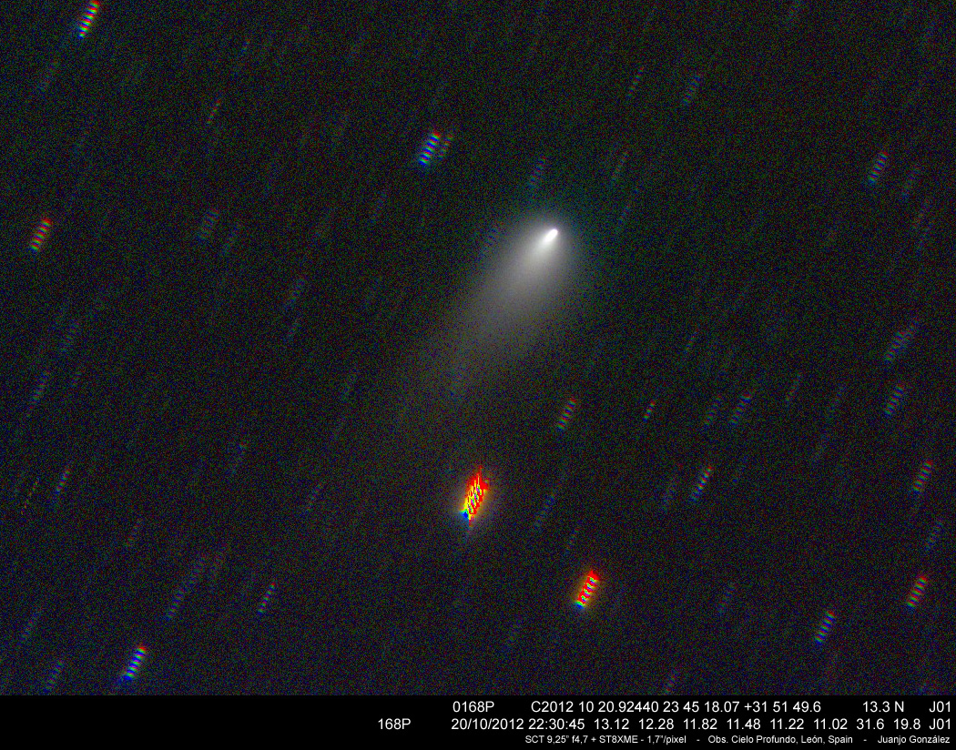 Imagen en color RGB del cometa más brillante que podemos contemplar ahora mismo, el 168P. Se encuentra a unos 74 millones de km. de nosotros, y su brillo está ya en disminución después de sus últimos estallidos de actividad. Hasta el año 2019 no volverá a presentar estas buenas condiciones de observación.