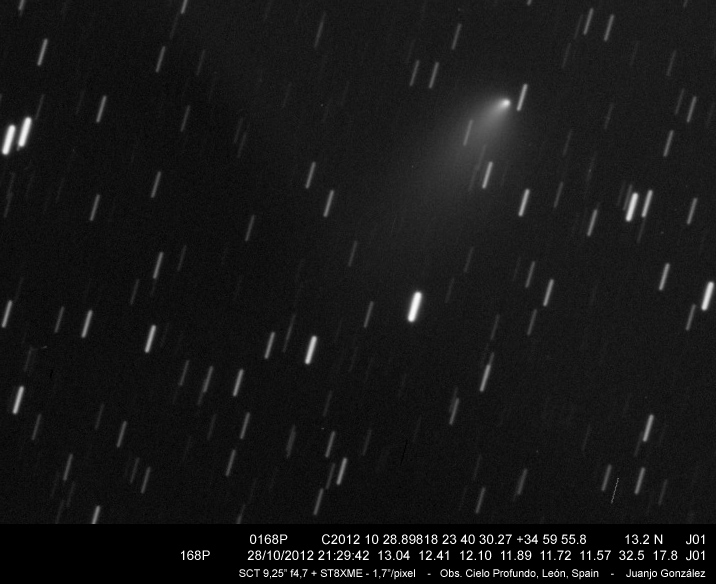 Varios obervatorios profesionales han podido apreciar una posible fragmentación del cometa 168P, que continua con sus estallidos de actividad. En esta toma realizada hace dos días, aún no puedo apreciar el segundo fragmento, que parece ser está separado del núcleo principal por sólo 2″ de arco.