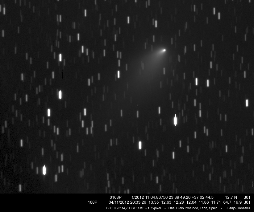Seguimiento del cometa 168P 5 noviembre 2012 • Juanjo Gonzalez Continuan las observaciones de este interesante cometa. De momento con mi equipo aún no puedo apreciar la fragmentación. Comparte esto: Haz clic para compartir en Facebook (Se abre en una ventana nueva) Facebook Haz clic para compartir en X (Se abre en una ventana nueva) X Me gusta Cargando... Relacionado