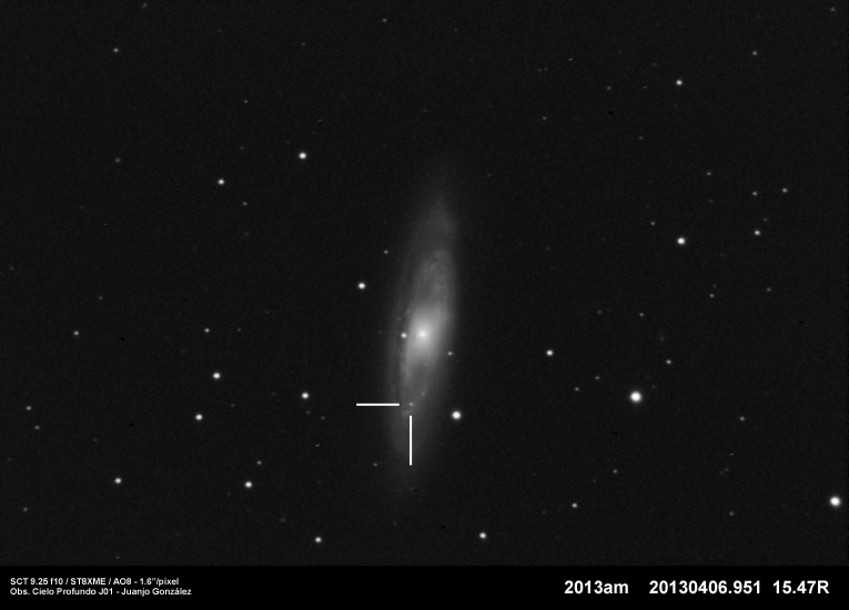 SN2013am en M65 9 abril 2013 • Juanjo Gonzalez Una nueva observación de la Supernova 2013am en la galaxia M65. Su brillo continua estable entorno a mag. 15 Comparte esto: Haz clic para compartir en Facebook (Se abre en una ventana nueva) Facebook Haz clic para compartir en X (Se abre en una ventana nueva) X Me gusta Cargando... Relacionado