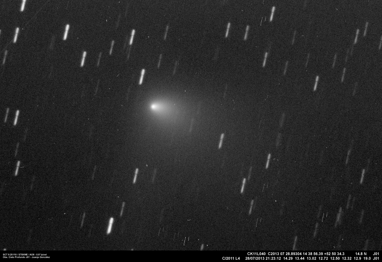 Cometa C/2011 L4 29 julio 2013 • Juanjo Gonzalez El cometa más espectacular de los últimos meses se aleja lentamente de nosotros, situado ya a 417 millones de km. de distancia. Su aspecto es mucho más discreto que hace unos meses, pero aún resulta interesante. Comparte esto: Haz clic para compartir en Facebook (Se abre en una ventana nueva) Facebook Haz clic para compartir en X (Se abre en una ventana nueva) X Me gusta Cargando... Relacionado
