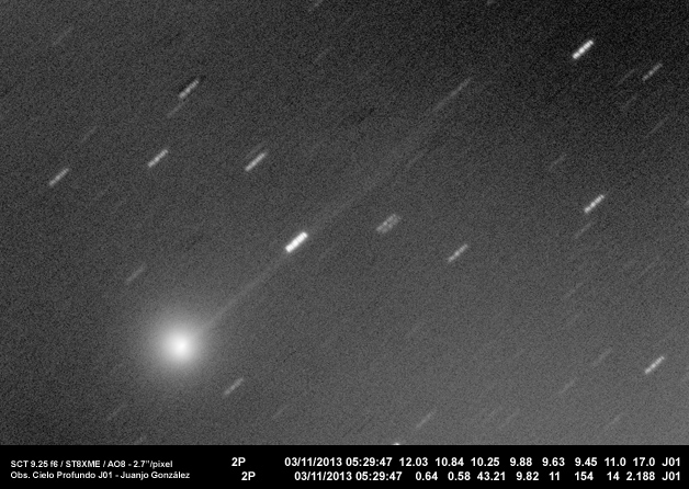 El cometa 2P (Encke) se hacerca al perihelio y ha desarrollado una importante actividad en forma de una coma pronunciada y una bonita, aunque débil, cola iónica. Se encuentra a 106 millones de km. de nosotros, y su visibilidad empeora cada día por su mala posición en el cielo al amanecer.