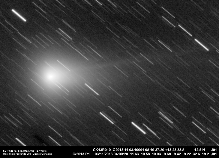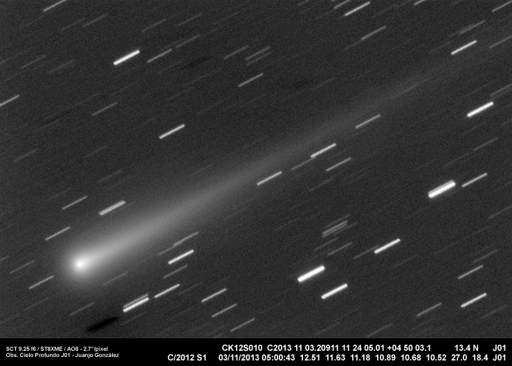 Por último tenemos el famoso ISON (C/2012 S1). Se encuentra a pocas semanas de pasar por el perihelio, pero su nivel de actividad es mucho más escaso de lo que cabría pensar a estas alturas de su órbita. Sigue teniendo un comportamiento muy pobre para lo que se esperaba, y ahora sólo queda esperar a ver que sucede los próximos días … algunas observaciones apuntan a un incremento de actividad en las últimas horas, habrá que seguirlo de cerca. Hay teorias para todos los gustos, incluso algunas que apuntan a una inminente desintegración y evaporación del cometa.