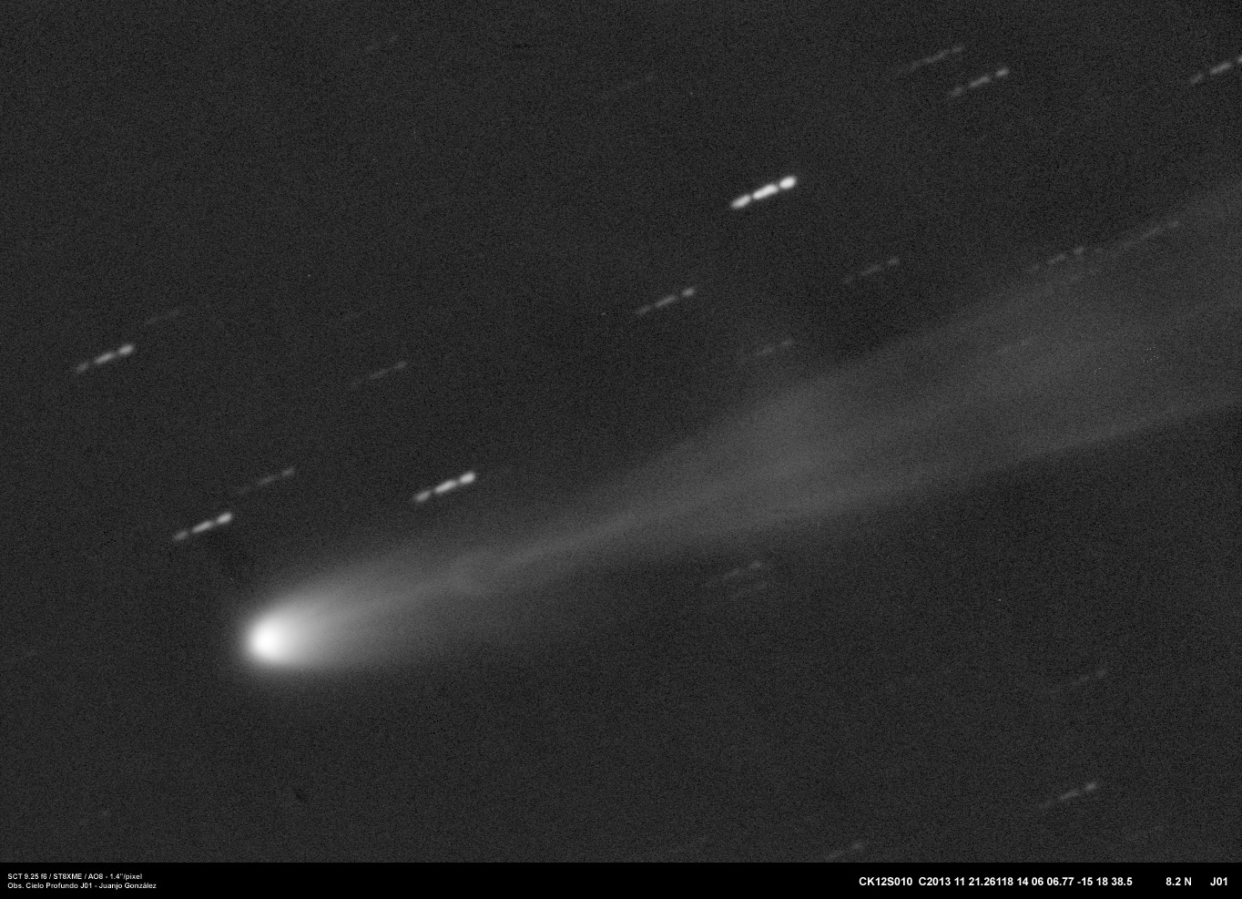 Ya al límite total de las posibilidades de mi observatorio, he podido fotografiar el cometa ISON con una elevación de apenas 8º sobre el horizonte y en pleno amanecer. Este es el aspecto que presenta ahora mismo, a pocos días del perihelio … lo esperaremos con impaciencia a su regreso tras su paso por las cercanias del Sol. Ha sido imposible obtener una medida fotométrica fiable, así que desconozco el brillo que pueda tener ahora mismo.