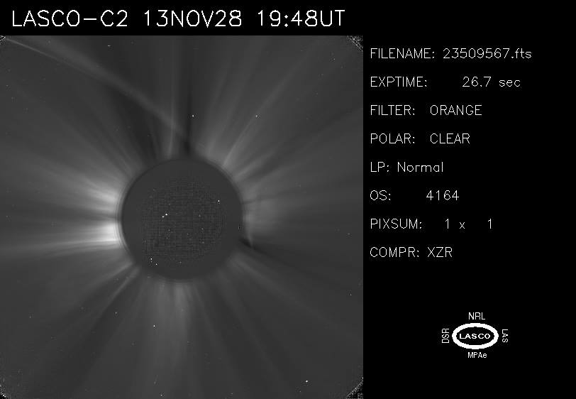 Última imagen de LASCO-C2. Se aprecia la tenue cola del cometa, sus restos vaporizándose en las cercanías del Sol, e incluso emergiendo por detrás de la máscara de la cámara. Todo indica que hasta aquí llega la historia de este cometa, que grandes momentos nos ha dado.